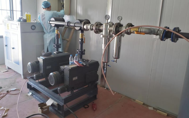 真空负压吸引系统机组选用油润旋片式真空泵,加装管道除菌过滤器和排气高温消毒灭菌设备。
