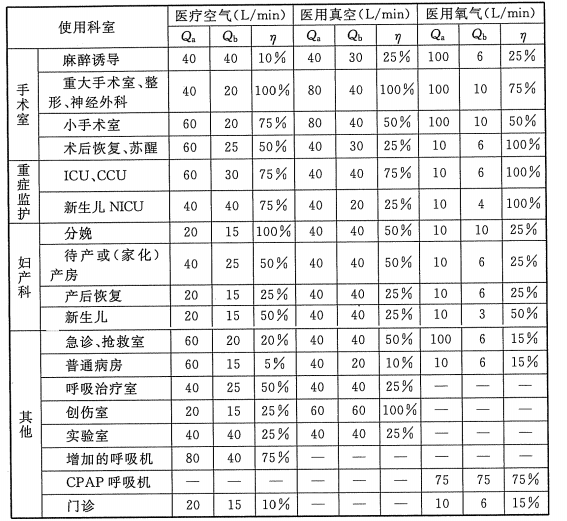 医疗空气、医用真空、医用氧气系统气源的计算流量中的有关参数,可按下表取值。