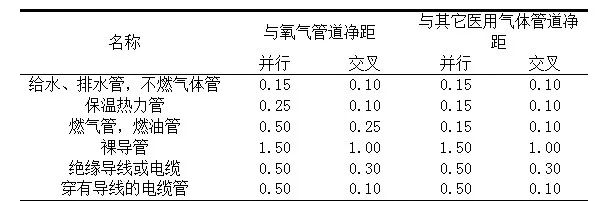 表2 架空医用气体管道与其他管道之间的最小间距(m)