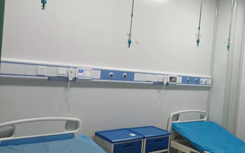 负压病房每间设立两个床位,隔离病房每间设立一个床位,分别安装医用气体设备和呼叫对讲系统设备。