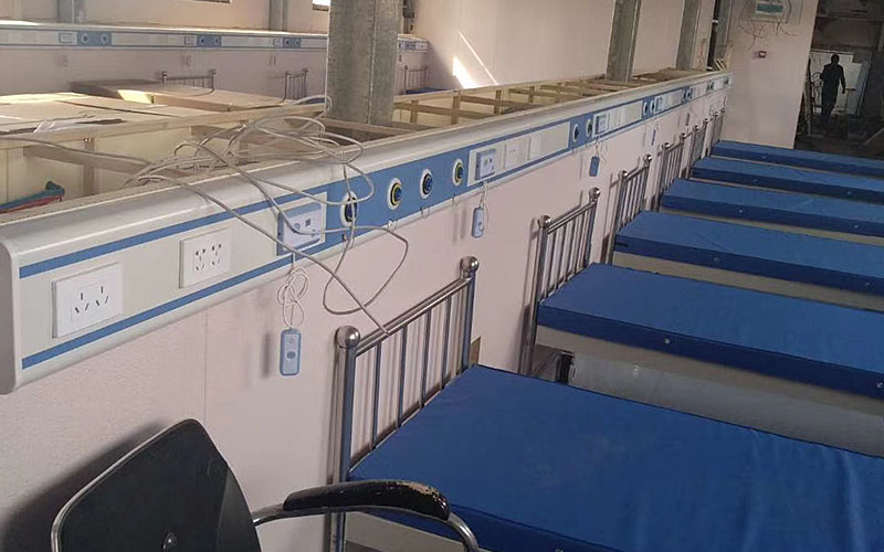 中心供氧系统由氧气站、供氧管道、稳压箱、阀门、氧气终端、报警装置、湿化瓶或呼吸机组成;压缩空气系统主要由空气压缩机、储气罐、干燥机、过滤器、输气管道、阀门组成;负压吸引系统的配置原理与供气系统相同,由吸引站、输气管道、检测报警装置和吸引设备组成。